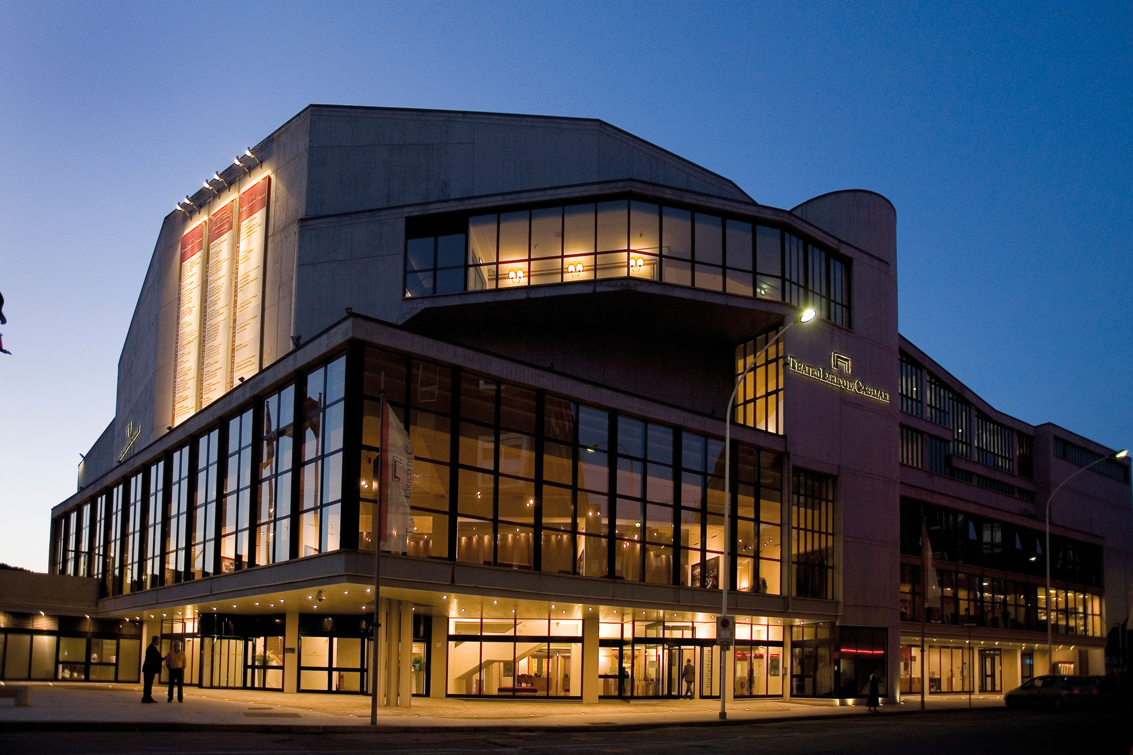 Il Teatro Lirico è stato inaugurato nel 1993, al termine di una lunghissima stagione di lavori cominciata nel 1964, con il bando di concorso per la realizzazione di un edificio teatrale per la città che sostituisse il Teatro Civico, distrutto dai bombardamenti della seconda guerra mondiale. Approvato nel 1967 il progetto degli architetti bergamaschi Ginoulhiac e Galmozzi, si diede il via alla costruzione della grande struttura: 5.000 metri quadri, i foyer, la sala di 1650 posti distribuiti fra platea e due ordini di gallerie, il palcoscenico (22 metri di larghezza per 14 di profondità) rivestito di pennellature di gesso e legno per una resa acustica ottimale e il golfo mistico sistemato su una doppia piattaforma mobile che permette diverse possibilità di utilizzo. Negli anni successivi all’inaugurazione vengono realizzate sale prova, laboratori, magazzini e locali per uffici. Il Teatro Lirico di Cagliari, sede dell’omonima Fondazione, è attivo tutto l’anno con stagioni sinfonico-cameristiche, liriche e di balletto. Sul palcoscenico, insieme all’Orchestra e al Coro del Teatro Lirico, protagonisti di molte produzioni di prestigio, si sono succeduti artisti di ottimo livello, che hanno concorso a determinare il rilancio dell’attività musicale cagliaritana. Il Teatro si inserisce nel più ampio sistema del Parco della Musica, che comprende anche il Teatro Carmen Melis, spazio dedicato alla programmazione musicale e alla valorizzazione della tradizione lirica cittadina, e i laboratori tecnici, destinati alla realizzazione di scenografie, costumi e allestimenti. Questi ambienti costituiscono una componente essenziale dell’attività produttiva del teatro, rendendo il Parco della Musica un articolato centro di produzione culturale, oltre che di spettacolo.