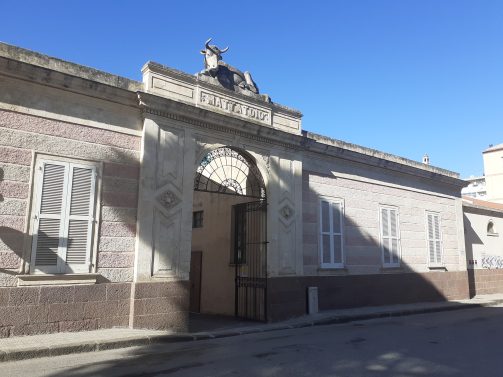 The new slaughterhouse replaced the old one, located at the historic area of Porta Rosello and The Civic Market. It was Cavalier Maurizio Pintus, a wealthy Sassarese, who financed the construction, advancing the sum and charging an 8 percent interest to the Municipality. The agreement was signed by the parties on May 18, 1895. The project was conceived by the Municipality’s technical office, headed by engineer Gavino Canalis. The area was chosen south of the city, in the area known as “La Cruzitta” or “La Crocetta.” The project was approved by the City Council on March 4, 1895. The plan is organized around pavilions neatly arranged according to the stages of processing and types of livestock. The main facade has at its center a ribbed portal, closed by an iron gate, with jambs carved with rams’ heads in the center, all crowned by the “pio bove” of Carduccian memory carved by sculptor Zichina (his signature is in the plinth, right). The façade continues symmetrically on either side of the portal with the lodgings of the janitor, veterinarian and director: the large and small perimeter pavilions have lunette openings and ribbed windows, molded wooden cornices embellish the eave lines. The 20th century saw the addition of a large flatbed scale in 1937 and a garage on Catalocchino Street corner of Diaz Street in 1949. Last note: Following the Messina Earthquake (December 26, 1908), Cavalier Pintus, on January 12, 1909, directed the municipality to donate what was left of his credit to the earthquake victims.